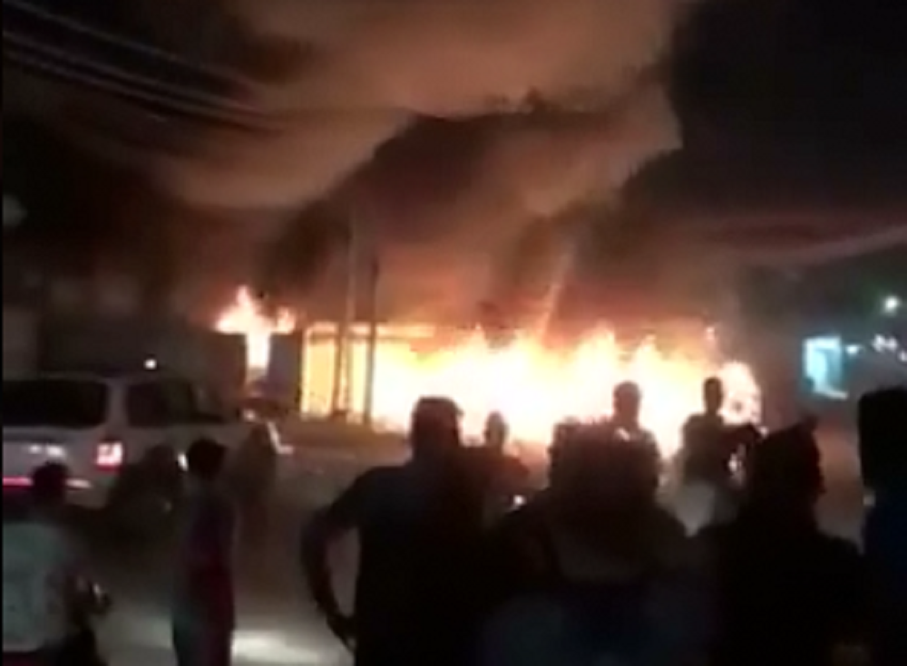 Breaking : protesters in Basra burn down the office of Kataib Hizbullah in Basra , Iraq. pic.twitter.com/ajP6jSXQ0s