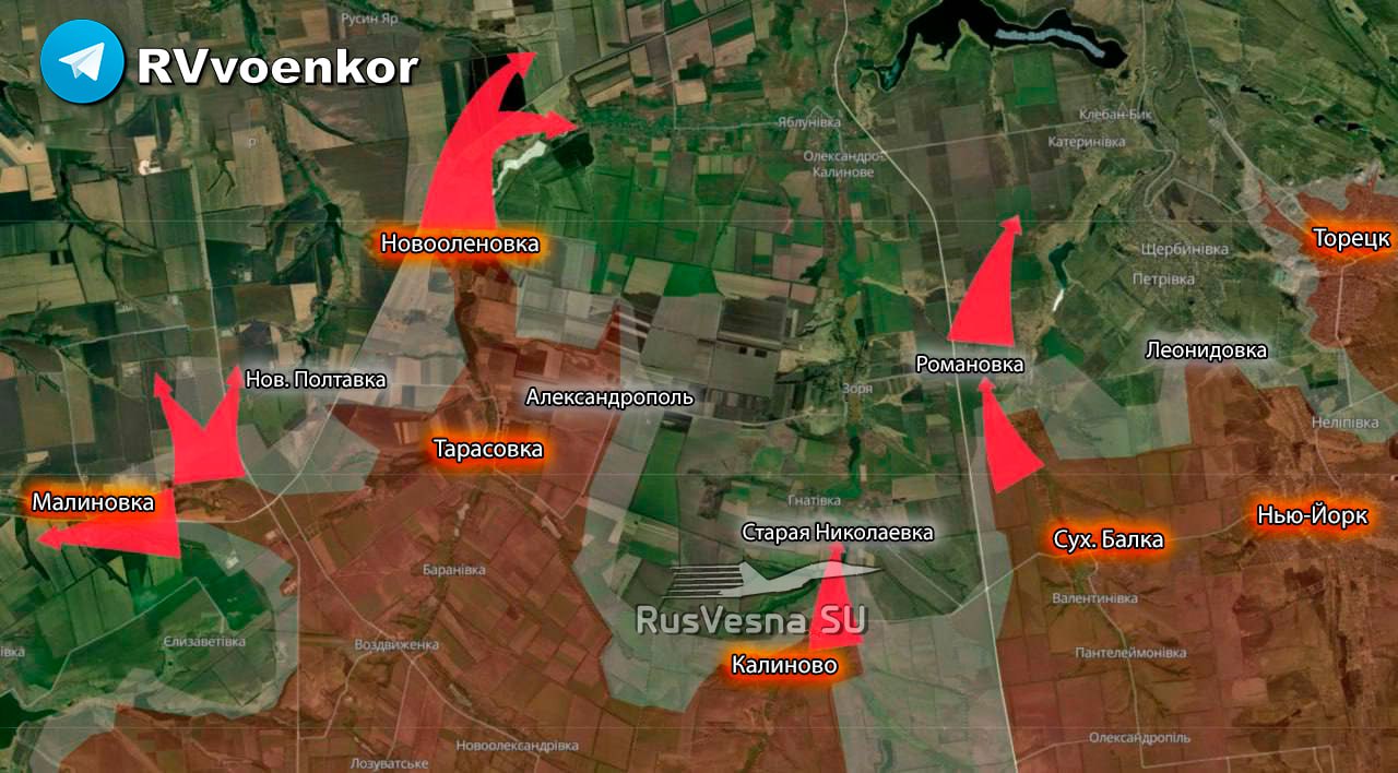 Према овим извештајима, руска армија тренутно врши јак притисак дуж линије Елизаветовка-Малиновка-Нова Полтавка-Новооленовка-Александропољ-Калиново. Руси су већ заузели Новооленовку, пришли су Новој Полтавки и ојачали своје позиције у Малиновки, што отвара могућност даљег напредовања у дубину украјинске одбране.