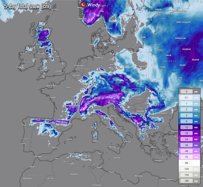 У наставку су приказане петодневне укупне снежне падавине широм континенталне Европе. Снег се прогнозира за многе области, укључујући север Велике Британије, север Пиринејског полуострва, Алпски регион, западни Балкан и централну Европу. Више снега се очекује и у источној Европи и Скандинавији.