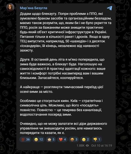 „Направите залихе, сарађујте. И најбоље од свега, размислите о привременом пресељењу ван града ове јесени и зиме. Ово се посебно односи на становнике Кијева“, пише посланица.