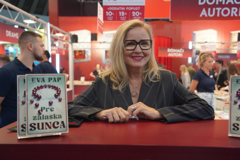 Ева Пап је први пут посетила Сајам књига, а читаоцима је представила емотивну и страствену љубавну причу у роману „Пре заласка сунца“ у коме се сусреће са питањима о пропуштеним шансама. Све то обојено је и кључним историјским, политичким и личним перспективама које доприносе богатој радњи.