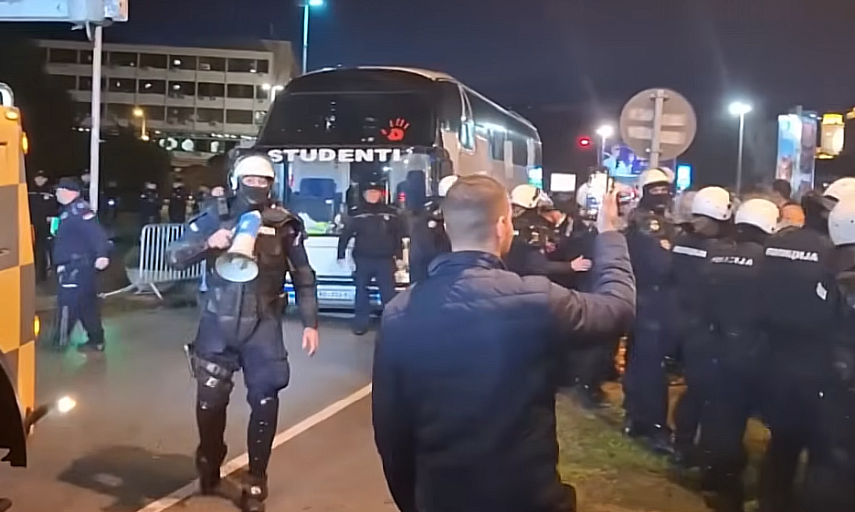Подсећамо, у Новом Саду је синоћ полиција грубо гурала штитовима грађане који су покушали да спрече одвожење аутобуса Миломира Јаћимовића испред зграде Бановине, а један припадник МУП-а снимљен је како брутално удара жену која је стајала у првом реду.