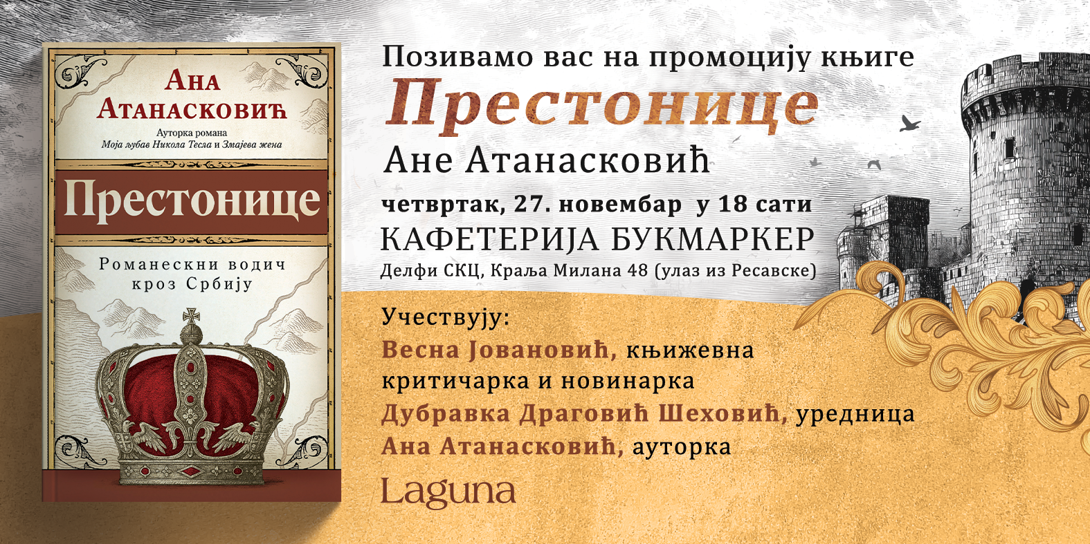О овом књижевном путовању кроз време и простор српских престоница од Београда, Крушевца, Смедерева, преко Сремских Карловаца, Крагујевца, Дебрца, до Ниша и Призрена, поред ауторке, говориће и књижевна критичарка и новинарка Весна Јовановић, као и уредница књиге Дубравка Драговић Шеховић.