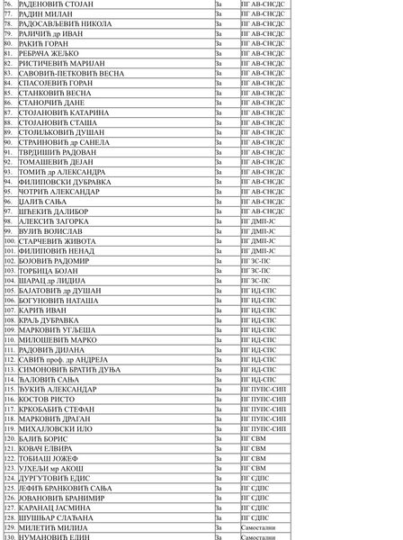 Скраћеница ПГ АВ СНСДС је од Посланичка група Александар Вучић – Србија не сме да стане. Скраћеница ИД СПС је од посланичке групе Ивица Дачић – СПС, скраћеница ДМП-ЈС је од Драган Марковић Палма – Јединствена Србија. Скраћеница ЗС-ПС је од групе посланика Здрава Србија-Покрет социјалиста, за ПУПС-СИП је Партија уједињених пензионера Србије – Солидарност и правда. Скраћеница ПГ СВМ је од посланичке групе Савеза војвођанских Мађара, а СДПС је од Социјалдемократске партије Србије (Расима Љајића).