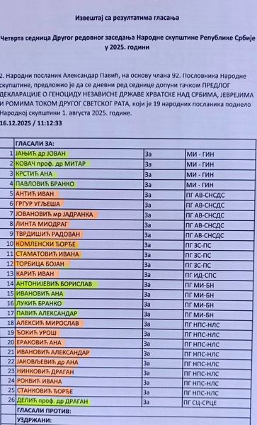 Ово је списак 26 посланика који су данас подржали стављање Декларације на дневни ред: