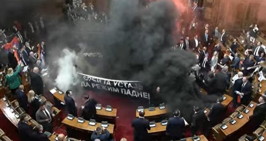 Убрзо након тога, запаљене су бакље какве се виђају на фудбалским стадионима од чега је скупштинска сала испуњена димом.
