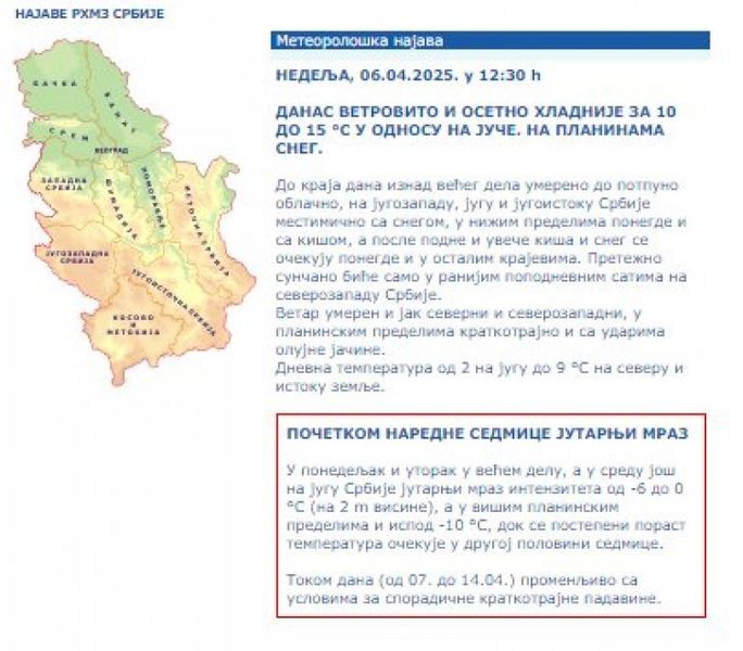 У понедељак и уторак у већем делу, а у среду још на југу Србије јутарњи мраз интензитета од -6 до 0 °С (на 2 m висине), а у вишим планинским пределима и испод -10 °С, док се постепени пораст температура очекује у другој половини седмице.