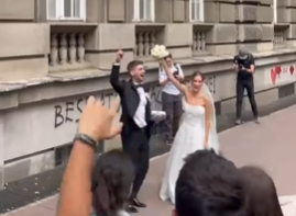 Младожења је у једном тренутку кренуо да скаче и да, са грађанима, скандира „Ко не скаче, тај је ћаци“.