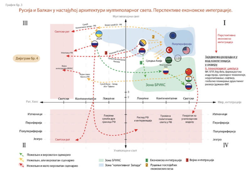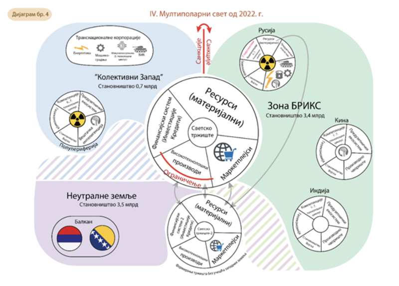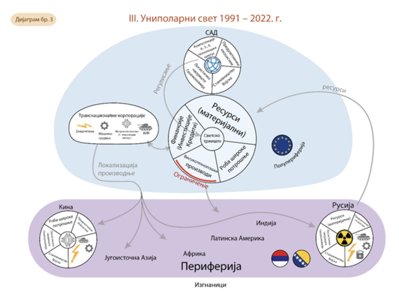 После распада СССР и преласка света на униполарни модел (1991-2022., дијаграм бр. 3), генерално је нестао социјалистички систем. Балканске земље, осим Србије и БиХ, интегрисане су у ЕУ и НАТО низом војних сукоба по различитим сценаријима. Земље које су ушле у западни блок под условима одрицања од суверенитета и јединственог развоја добиле су повећање просечног животног стандарда становништва. Деградација система провере и равнотеже довела је до бројних сукоба на Балкану и у СССР.