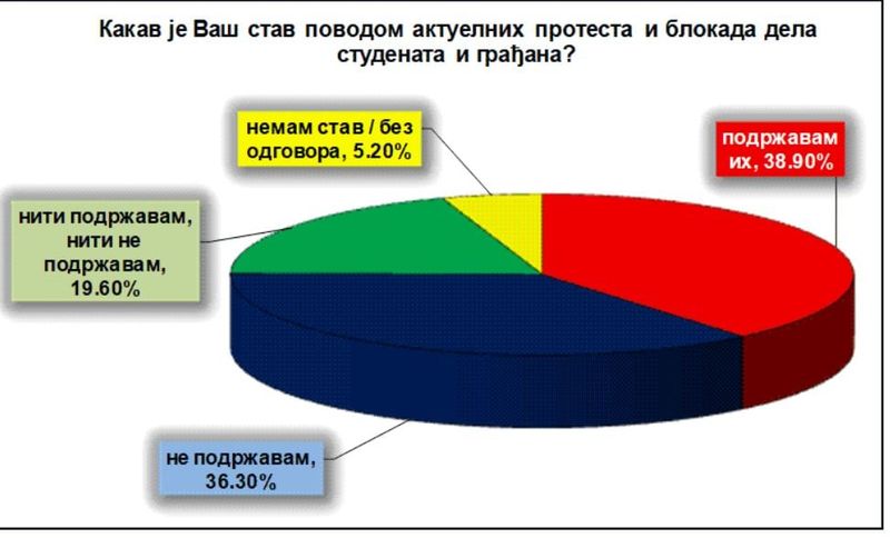 На питање о протестима, 19,6 одсто испитаних је казало да нити подржава, нити не подржава, док 5,2 одсто није имало став, наводи се у истраживању на сајту НСПМ.