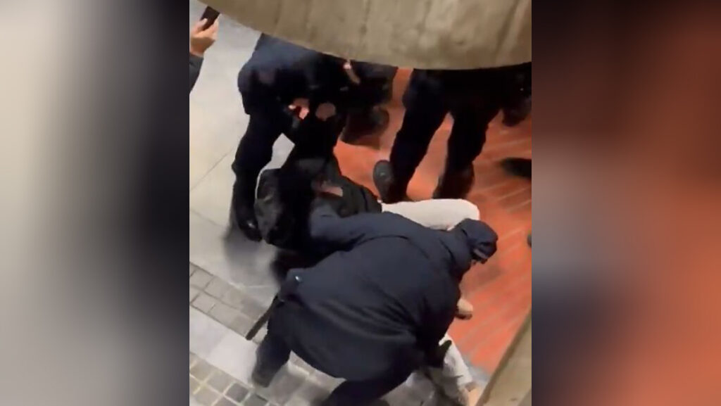 На снимку испод се може видети како једног студента вуку по поду.