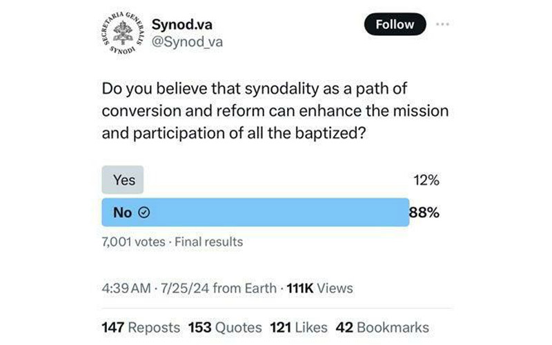 Службени Х-профил Ватикана Synod.va, посвећен синодалном устројству Католичке цркве, замолио је своје претплатника да одговоре на питање: „Да ли ти мислиш, да саборност као пут преобраћења и реформе може ојачати мисију Цркве и учешће свих крштених у њој?"