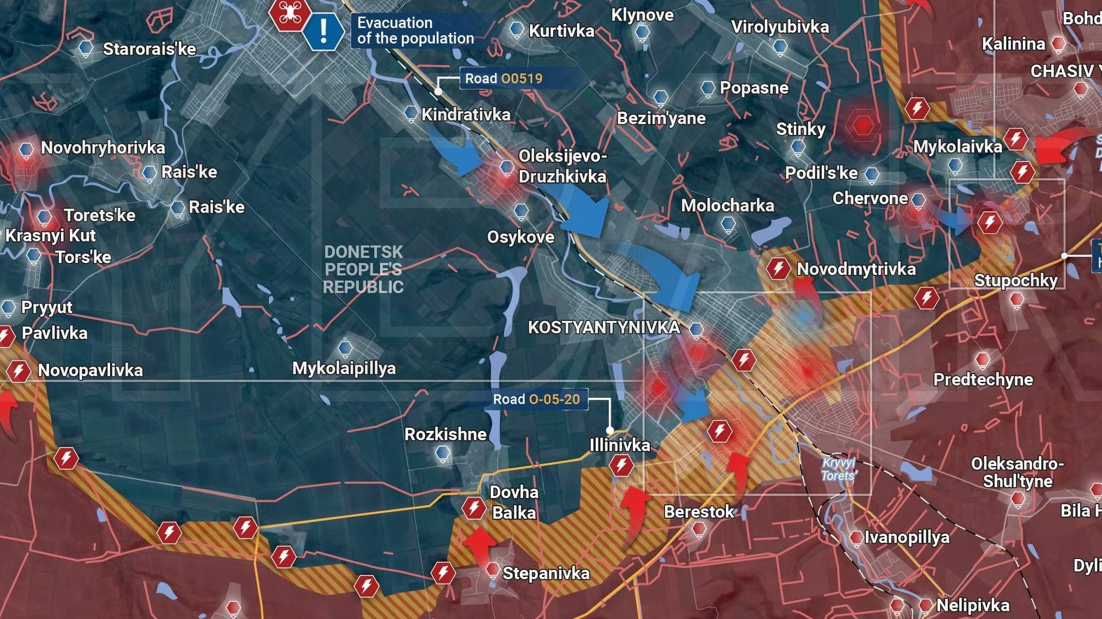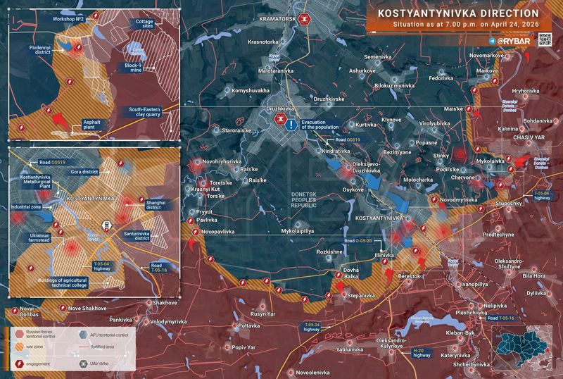 Ситуација у Константиновки од јутра 25. априла 2026-те ушла непрекидно се погоршава за снаге кијевског режима. Град је под масивним притиском руских трупа, које користе тактику са малим јуришним групама и ударима помоћу беспилотних летелица.