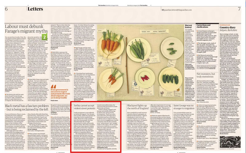 Kako se jasno vidi na fotografiji, Vučićev stav o onome što je „Gardijan“ objavio nekoliko dana ranije, smešten je među pismima čitalaca, a neke od tema su problemi sa muzičkim pravcem blek metal, stavovi o intervjuu sa Nikom Klegom (britanski penzionisani političar i nekadašnji vođa Liberalnih demokrata), a tu je i rubrika „Country diary“, odnosno, kako je „Gardijan“ opisuje – „dnevni izveštaji sa sela i iz prirode iz najstarije novinske kolumne na svetu“.