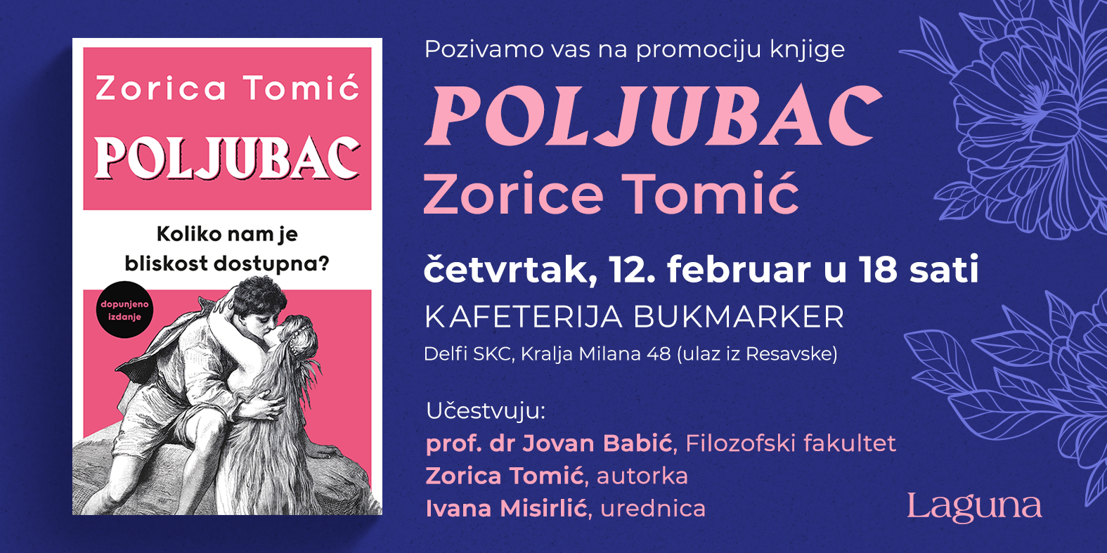 Knjiga „Poljubac“ prof. dr Zorice Tomić biće predstavljena 12. februara od 18 sati u knjižari Delfi SKC. O knjizi će, pored autorke, govoriti i prof. dr Jovan Babić sa Filozofskog fakulteta, i urednica Ivana Misirlić.