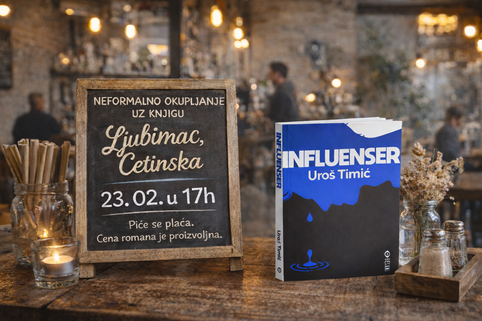 Pisac Uroš Timić organizuje neformalno književno okupljanje povodom svog romana "Influenser", koje će biti održano u ponedeljak, 23. februara od 17 časova u kafiću „LJubimac“ u Cetinjskoj ulici. Umesto klasične promocije, autor najavljuje intiman susret sa čitaocima, zamišljen kao opušteno druženje uz razgovor, čitanje odlomaka i upoznavanje publike sa svetom iz knjige.