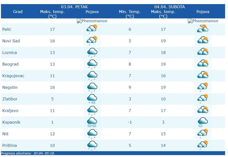 U subotu (04.04.) prestanak padavina i delimično razvedravanje, osim na jugu i istoku Srbije, gde se kiša očekuje još ujutro i pre podne (a na visokim planinama i sneg sa tendencijom prestanka).