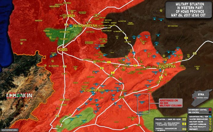 Јуче су Руске ваздухопловствне снаге и сиријско ратно ваздухопловство уништили велику колону возила Исламске државе која су се кретала северно од подручја Заза. Мапа на слици слици приказује наведени положај ваздушних напада.