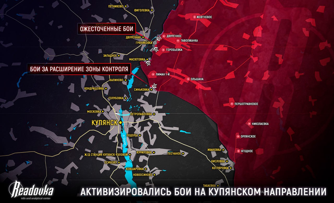 Северно од Лиман Први јединице Оружаних снага Русије такође су започеле офанзиву у области села Масјутовка. У овом тренутку се води жестока борба за село Грјаниковка, Украјинци покушавају да спрече ширење зоне контроле руских трупа на левој обали Оскола северно од Купјанска. Ако Украјинци изгубе контролу над обалном зоном на левој обали реке, то ће створити предуслове за напад на Купјанск у два главна правца – са истока и севера.
