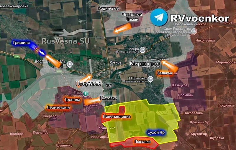 Украјинске трупе су опкољене у џепу југоисточно од Покровска, у области Новопавловке, Сувог Јара и Лисовке.
