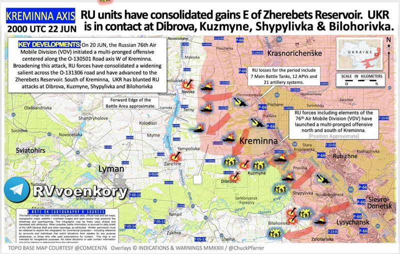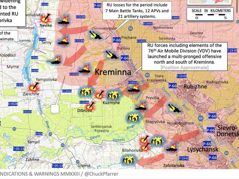 "Руске снаге започеле су мултилатералну офанзиву усредсређену на осу пута о-130501 западно од Кремене. Проширујући овај напад, руске трупе су учврстиле шири излаз преко аутопуте о - 131306 и напредовале до Жеребецког водозахвата", рекао је Чак Пфаррер.