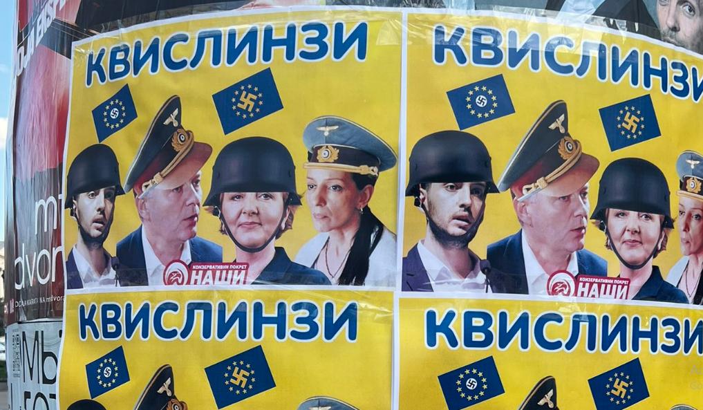 "Срамна политика Ђиласове прозападне опозиције која се огледа у гебелсовским измишљотинама о изборним крађама досегла је свој врхунац после наступа поменутих Квислинга с плаката у Европском парламенту у којем позивају на санкције Србији и замрзавање новчаних фондова од чега наносе директну штету грађанима", саопштили су Наши.