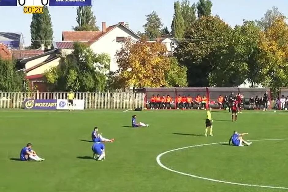 Наиме, управо су гости имали први напад на утакмици, нападач Евген Павлов је извео почетни ударац, лопта ке избијена у аут, а онда су сви сели на земљу у знак протеста због кашњења плата. Цео прекид је трајао 20 секунди, за то време ни играчи Кабела нису нападали, те су испоштовали противника.