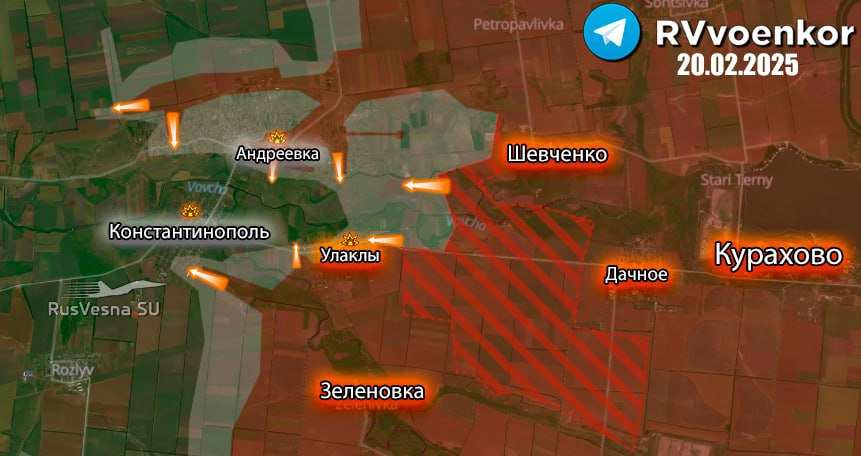 У правцу Константинопоља, Руси су заузели „Кураховски џеп“ и настављају да врше притисак у области насеља Улаклија и Константинопоља. Неке од руских јуришних група се пребацују у област суседне Андрејевке (правац Покровск), која се такође активно чисти од снага Оружаних снага Украјине.