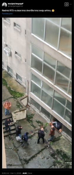У зграду РТС-а успела је да уђе група запослених, а како је за Н1 рекао Алекса, студент Математичког факултета из Новог Сада, запослени су из једног оближњег хаустора ушли кроз сутеренске просторије.