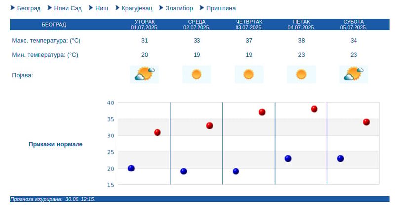И у Београду врело наредних дана. У четвртак јутарња температура биће 19 а највиша дневна 37 степени, док ће у петак јутарња бити 23, а највиша 38.