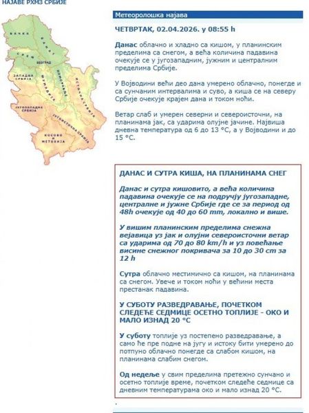 - Данас облачно и хладно са кишом, у планинским пределима са снегом, a већа количина падавина очекује се у југозападним, јужним и централним пределима Србије.