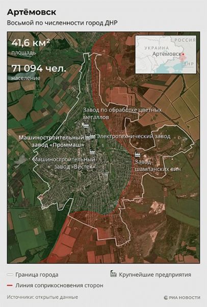 Agencija RIA novosti je objavila mapu koja prikazuje trenutno stanje u Bahmutu (rus. Artjomovsk).