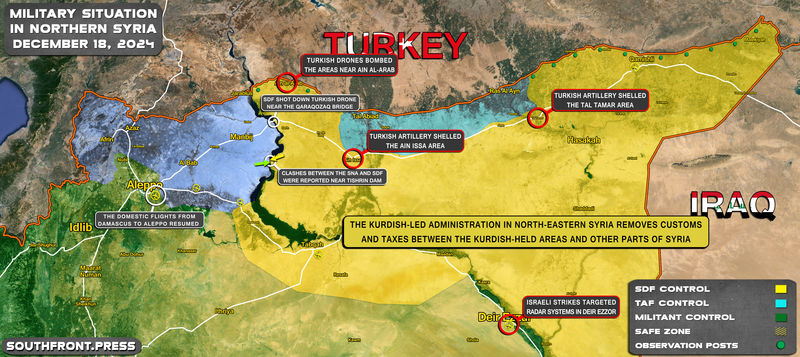 Prijavljeni su sukobi između proturske SNA i kurdske SDF u blizini brane Tišrin. SDF je oborio turski dron u blizini mosta Karakoza, turske bespilotne letelice bombardovale su oblasti u blizini Ain al-Araba, turska artiljerija je granatirala područje Ain Ise i područje Tal Tamara.