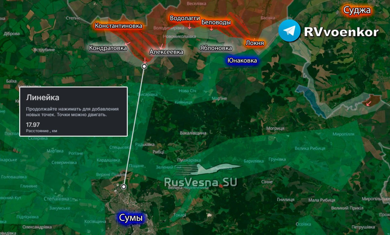 Ruska vojska nastavlja snažan proboj u Sumskoj oblasti, gde se već približila gradu Sumi na distanciju od svega 20–25 kilometara – što otvara mogućnost direktnog udara FPV-dronovima sa optičkom vezom. Prema izveštaju resursa Deep State, povezanog sa ukrajinskim GUR-om, situacija na terenu za VSU postaje kritična.